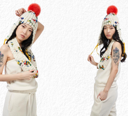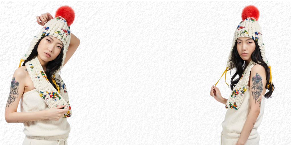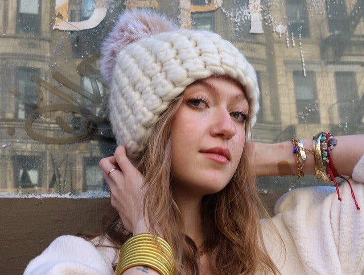 every piece is handcrafted from start to finish in mischa lampert’s new york cIty studio. crafted with the finest, ethically sourced merino wool. the entire process, hand spinning the yarn, crocheting the hats, and knitting the snoods is done by hand in studio.