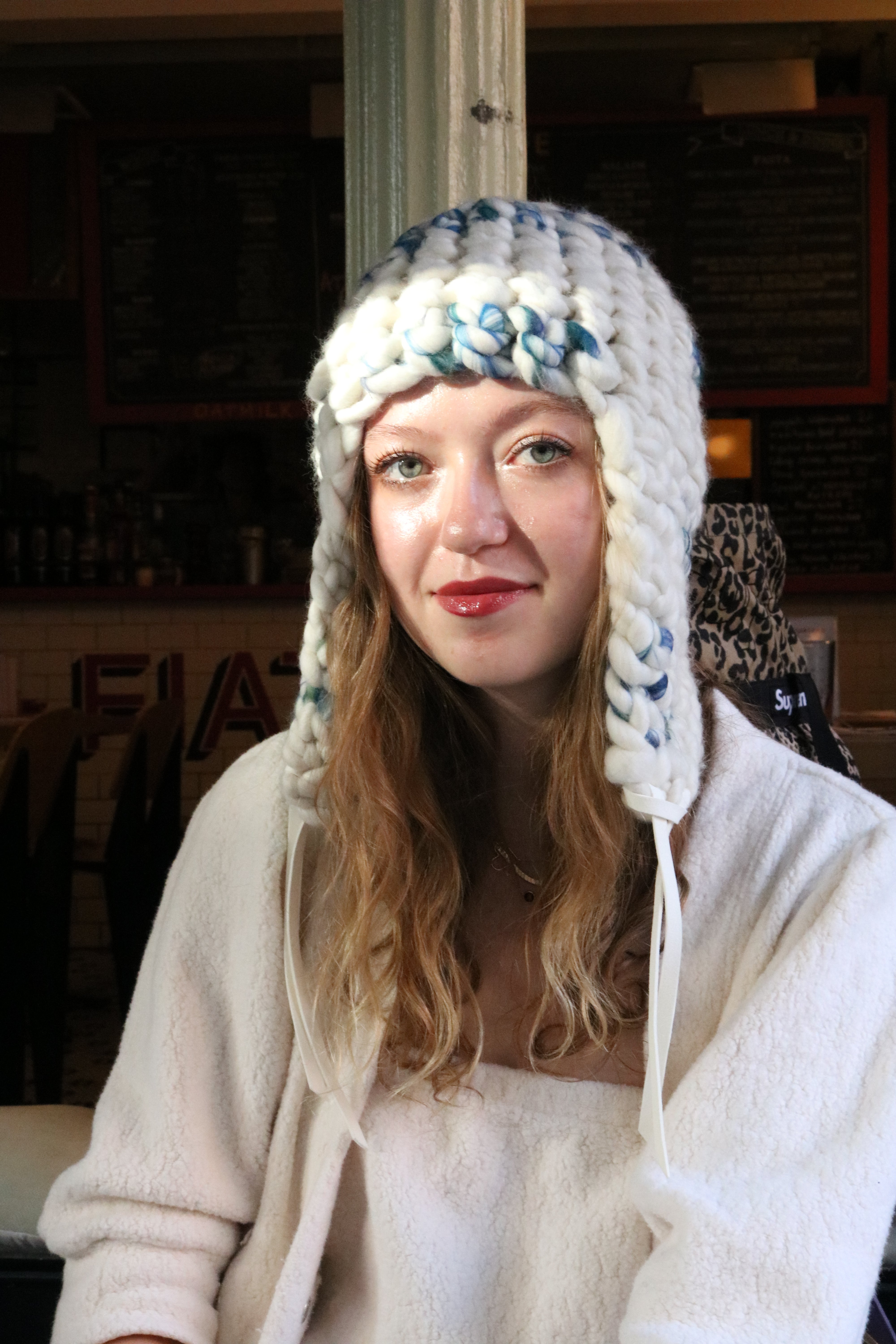 design | the fro tri - xl pom on top, white straps on bottom that can be used to tie the ear flaps back if you choose