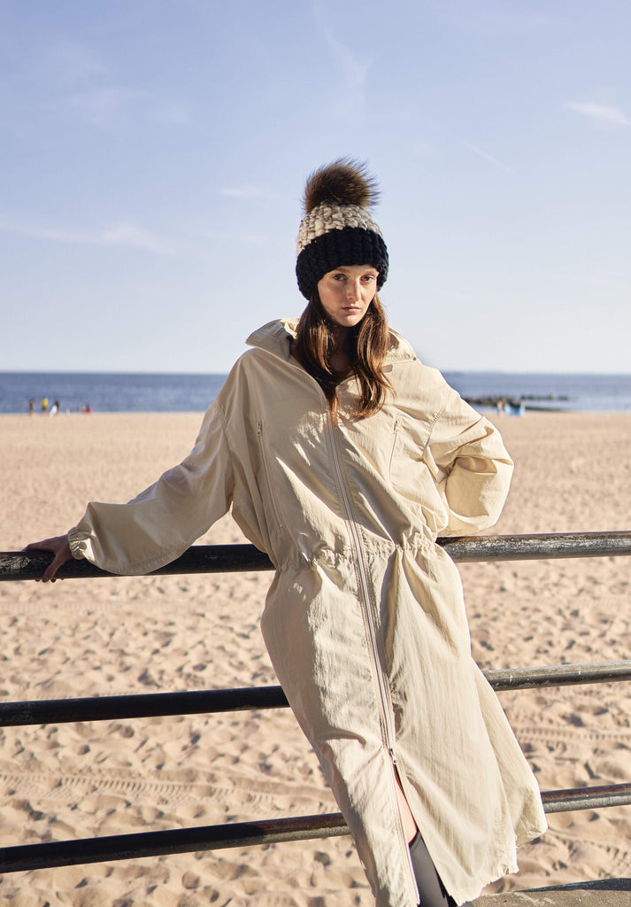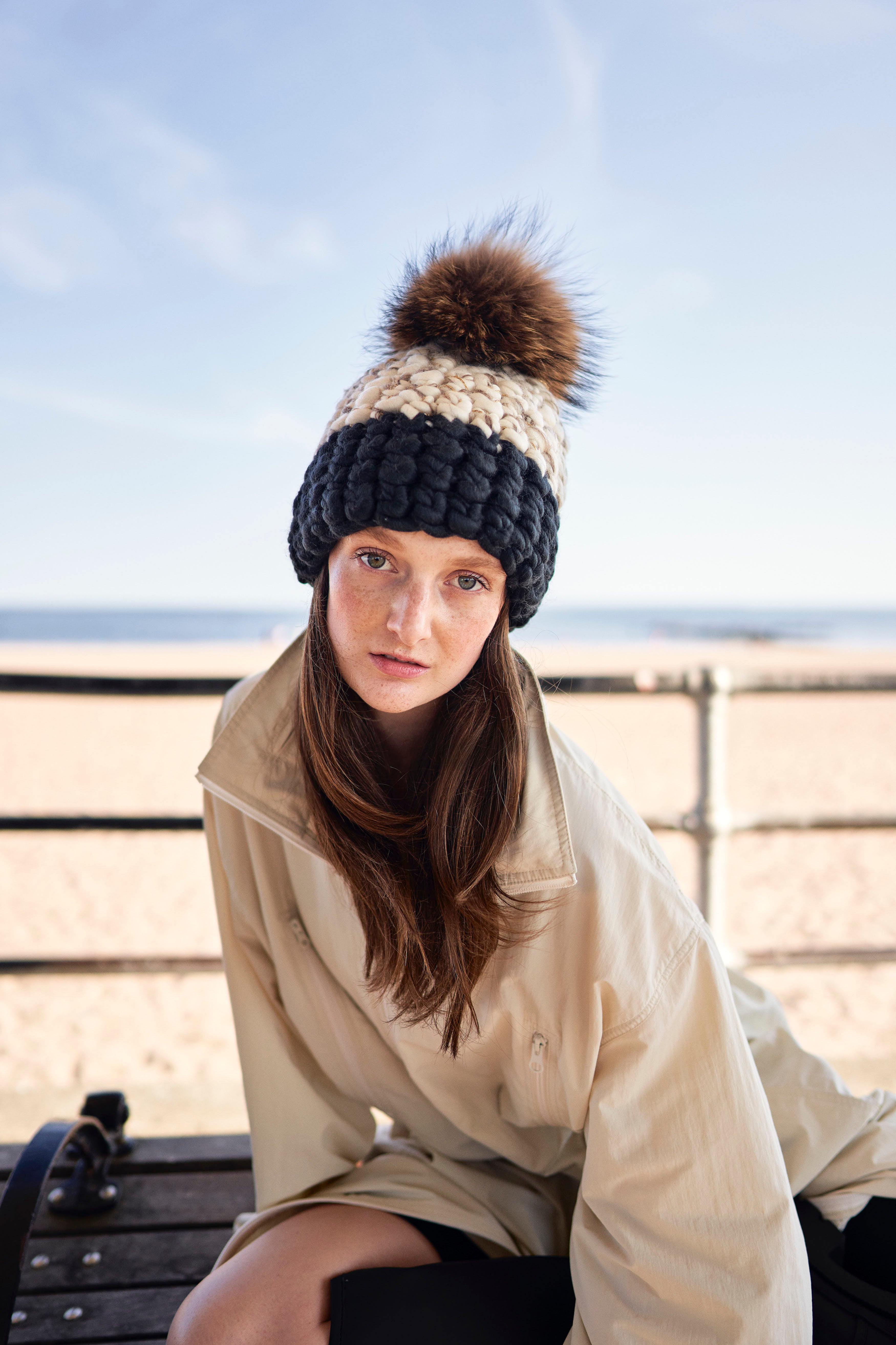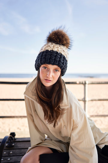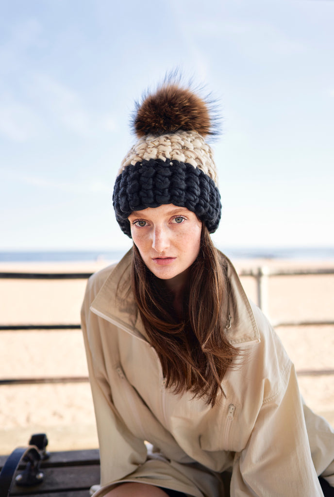 white/marble blend + gold sparkle | dark grey beanie color block + raccoon xl pom