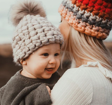 emilee durrant’s adorable son is wearing our kids pewter + taupe beanie pomster in small. @thesimplicityblog